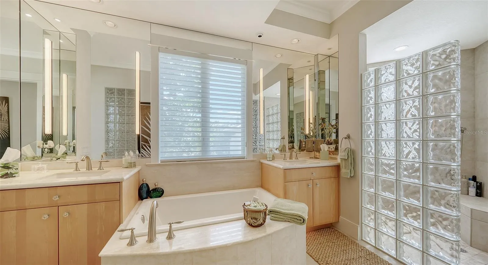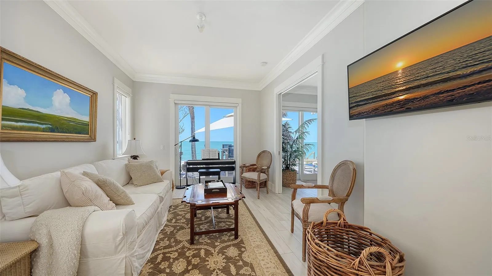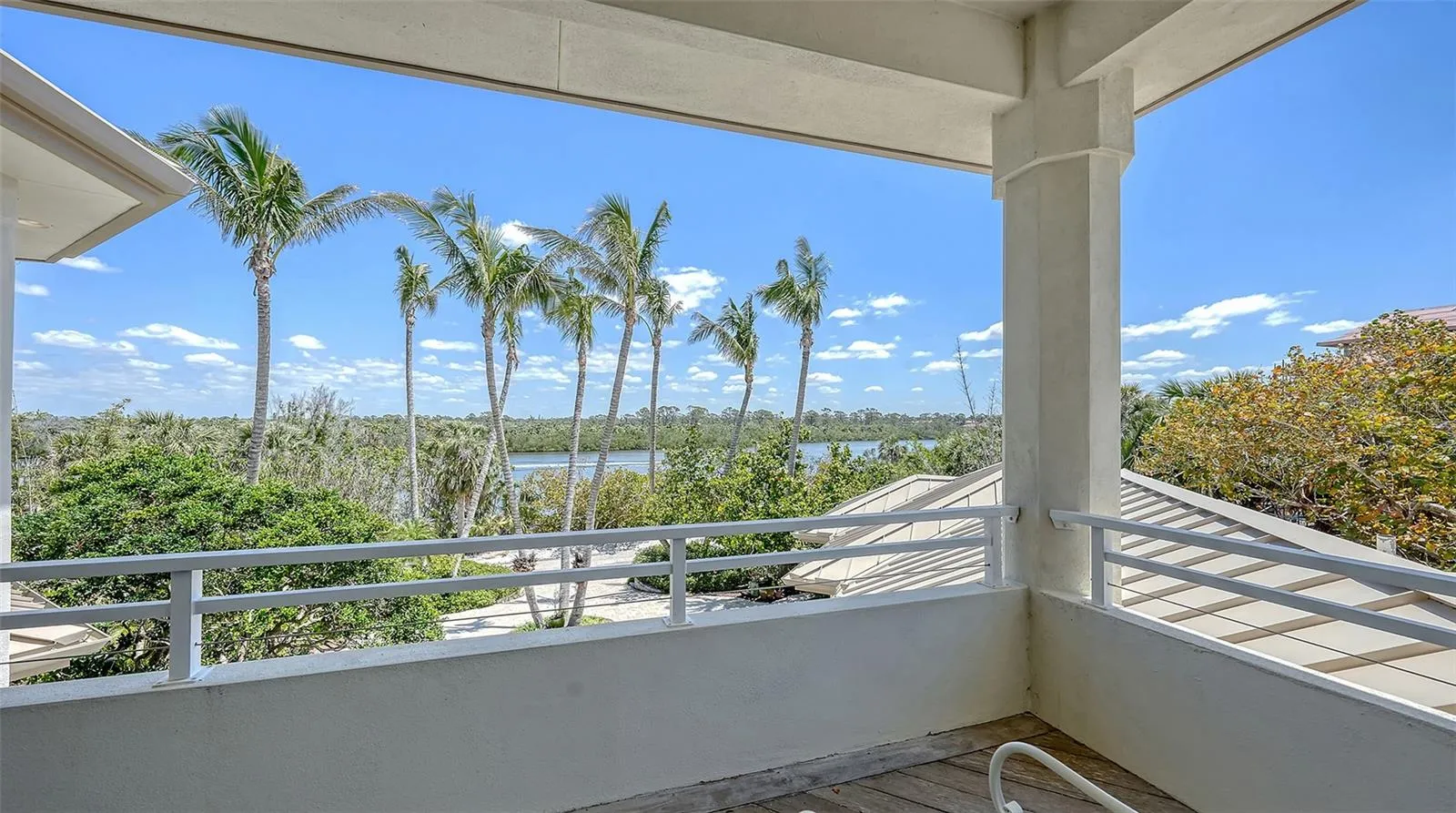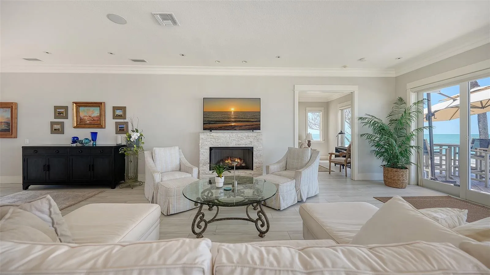 The home’s thoughtful layout provides separation and privacy for family and guests. Two ensuite bedrooms on the ground floor are positioned in their own wings, while a flexible third ensuite—currently used as a den—can easily become a fourth bedroom, also having a large storage closet and beautiful Gulf views. Upstairs, the spacious master suite is a peaceful retreat with stunning beach and bay views, with a two-sided fireplace, sitting area, spa-like bath, and a private Brazilian walnut wood deck overlooking the Gulf. A second covered balcony on the bay side and a refined office with custom built-ins round out the upper level.
