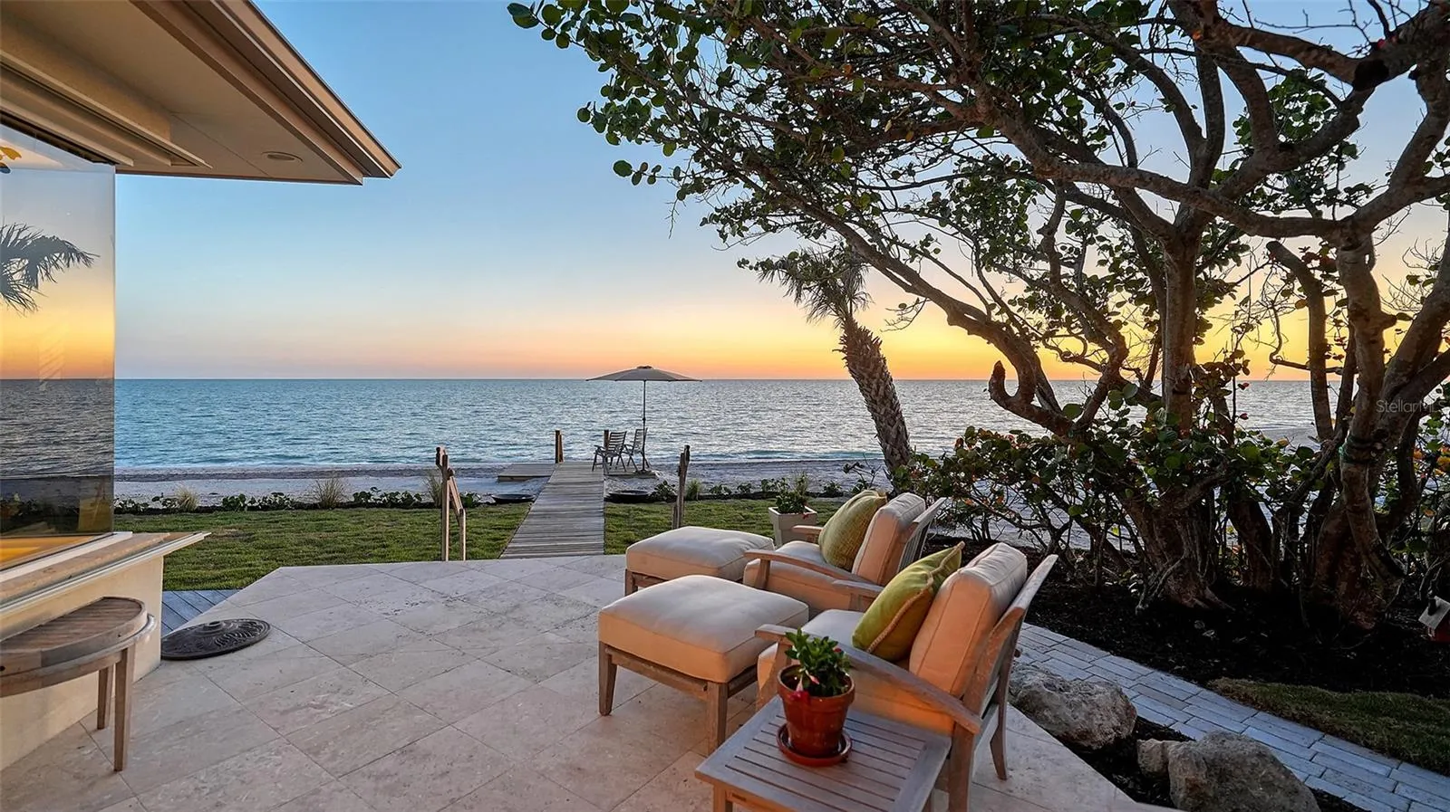 The chef’s kitchen features generous cabinetry, new Dolomite countertops, ample storage, and windows that frame both the Gulf and the pool, blending indoor comfort with natural inspiration. Just outside, the shell-stone lanai is your private oasis: a heated pool and spa surrounded by lush native gardens, a built-in Wolf grill, skylights for natural light, and a pool bath for added convenience—all just steps from the sand.
