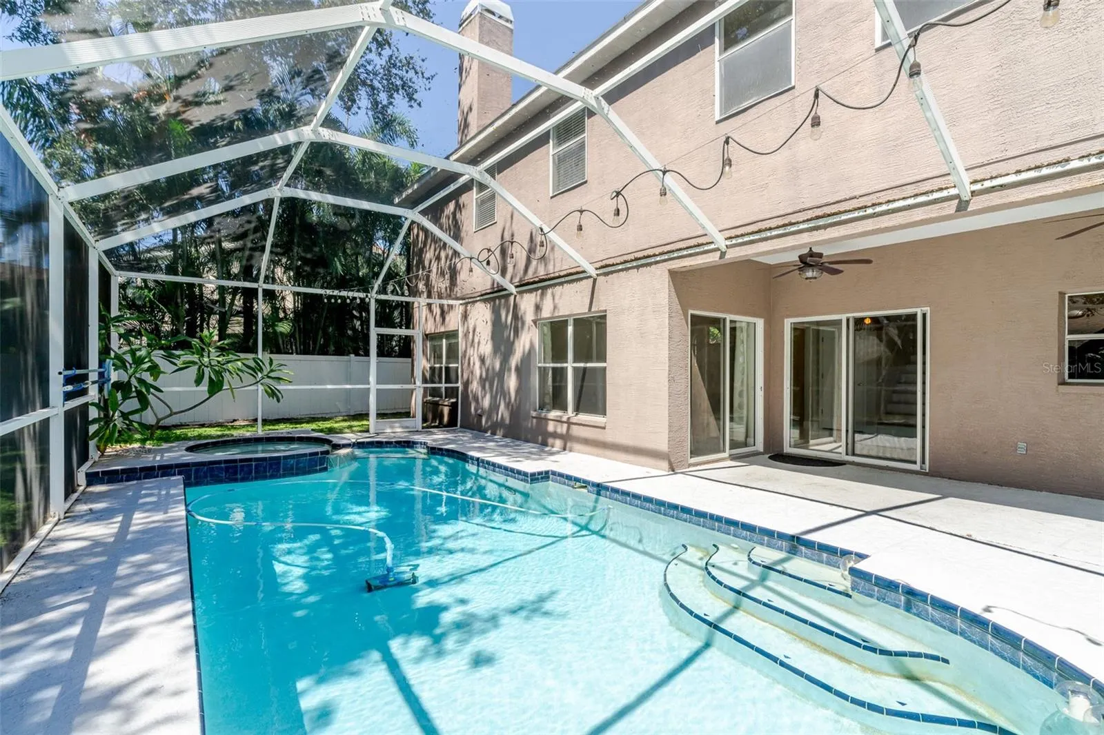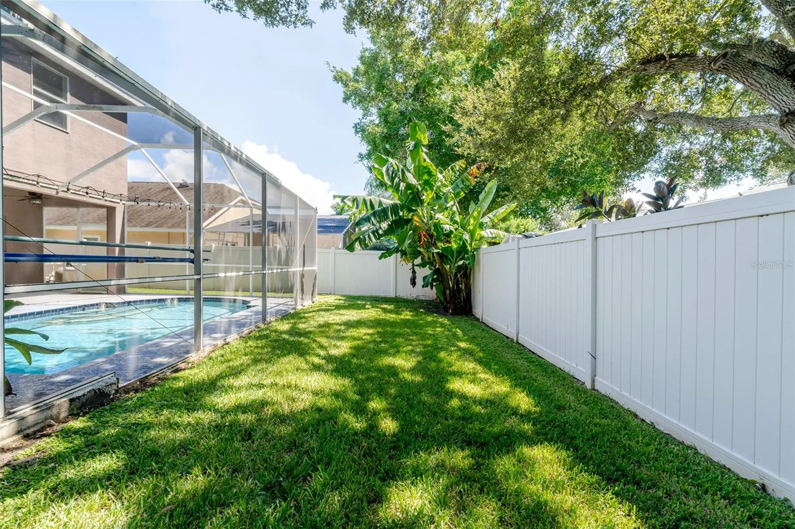Enjoy a screened-in lanai with a sparkling heated pool and spa, perfect for relaxing or entertaining. Newer Pool pump, heater and filter. There is a large backyard with your own banana trees. Inside, you’ll find a cozy wood-burning fireplace in the main family room which is open concept to the kitchen. With a formal living and dining area as well. This home includes updated bathrooms, and a tankless hot water heater (2023). Roof 2016, HVAC 2017