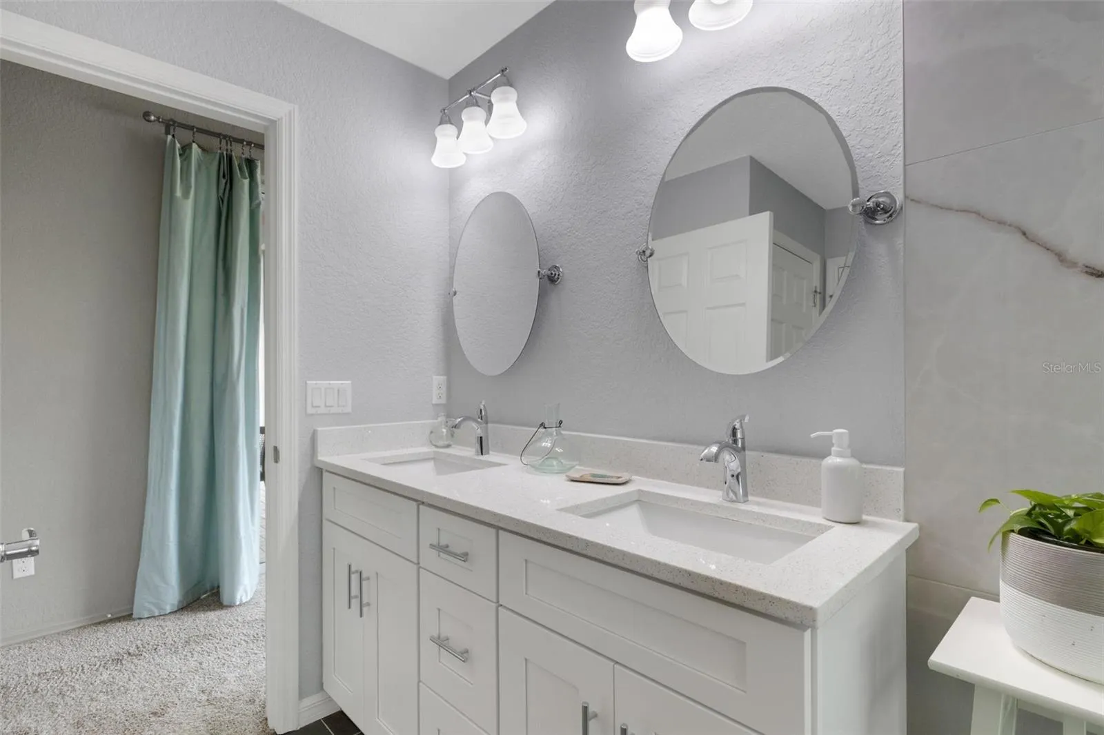 Drive through the gates into the oasis that is Del Webb Orlando and fall in love with this beautifully updated two-story residence. On a prestigious corner lot with a stunning mature live oak tree and overlooking the White Heron golf course, this immaculate 2,086-square-foot home combines timeless style with modern upgrades. The floor plan features a first-floor primary suite with a luxuriously remodeled bath and walk-in closet and a second bedroom/den with an adjoining remodeled bath. The primary suite bathroom features two sinks with quartz countertops, a stand-alone modern tub, modern floor-to-ceiling tiles, walk-in shower, linen closet, and private water-closet. The second bathroom features a remodeled floor-to-ceiling tiled shower with glass doors. The upstairs loft houses the third bedroom, bathroom with a tub convenient for children’s baths, and lovely front room full of natural light perfect for a sitting room, art room, or office. Ceiling fans throughout the house provide year-round comfort. You enter the home through the front door with side lights into the airy, open floor plan onto the enclosed lanai with golf course view. The eat-in kitchen features stainless steel appliances, a recently purchased refrigerator with French doors and two freezer drawers, gas stove, granite countertops, wood cabinets with bottom pull-outs and a tile backsplash.