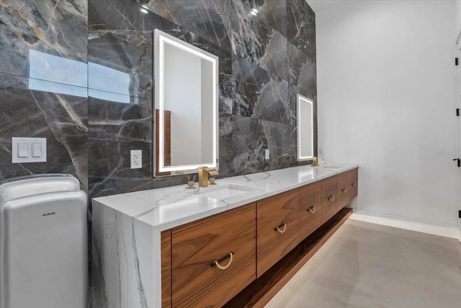 The primary suite is a private retreat with a spa-inspired bath, custom walnut cabinetry, dual shower with body jets, and a grand walk-in closet. Each guest suite offers its own spa-like bath.