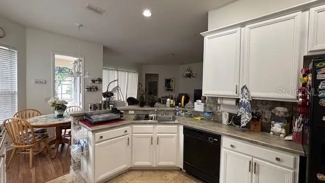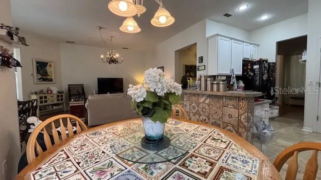 The home features a screened-in pool, providing a private outdoor space that can be enjoyed year-round. Inside, the layout is open and functional, with a spacious living and dining area that flows into the kitchen, which is equipped with modern appliances and plenty of storage space.