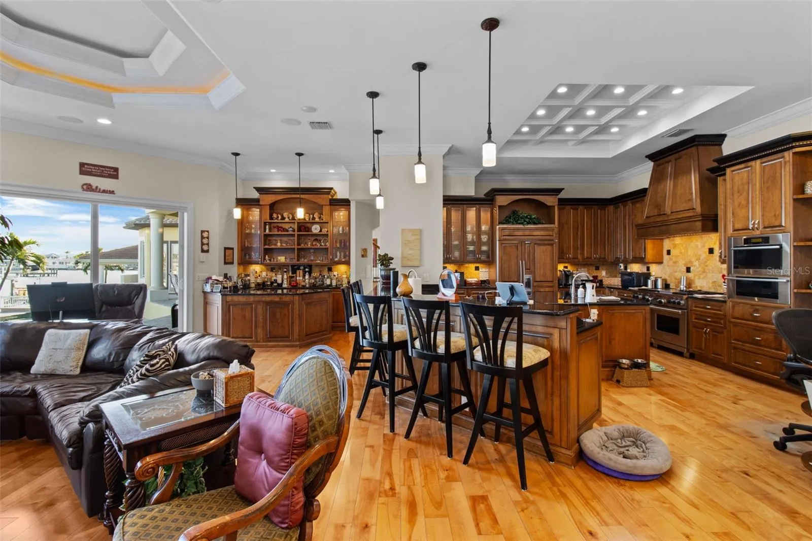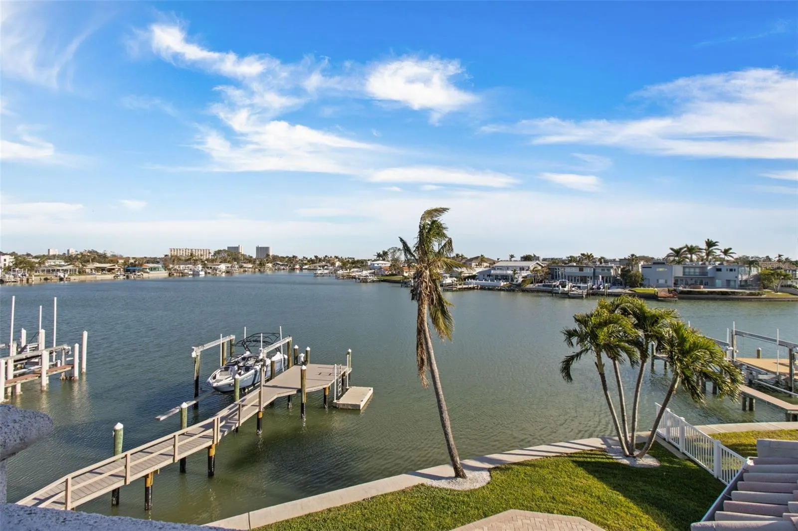 This elevated 5,798 sq. ft. waterfront estate in Yacht Club Estates combines timeless elegance, modern convenience, and unmatched structural integrity. With 117 linear feet of seawall, it’s a boater’s dream—complete with a 15,000 lb. boat lift and floating dock. Built on engineered landfill to raise the elevation, the home remained safe during Hurricane Helene, with only 2 inches of water entering the garage while nearby homes suffered over 2 feet. Solid block and poured concrete construction, a commercial-grade Epicore second-floor system, hurricane-impact windows and doors (rated to 150 mph), a 12-inch raised seawall, and whole-house generator hookups deliver lasting peace of mind. The 5-bedroom, 5-bath layout includes a downstairs bedroom perfect for a private office, a theater-ready media room with projector and recliners, an upstairs game room with wet bar, wine rack, and gym platform, plus a loft with two built-in desks, bookshelves, and file storage. The open-concept kitchen is a chef’s dream, featuring Wolf appliances including a double oven with griddle and grill, steamer, warming drawer, Sub-Zero fridge with filtered water, dual Fisher & Paykel dishwasher drawers, full and prep sinks with disposals, a walk-in pantry, and built-in desk. Nearly every room captures stunning water views. Custom California Closet systems enhance every closet and pantry. Step outside to enjoy two oversized balconies with sunrise and sunset views, and a resort-style PebbleTec saltwater pool and spa (with new 2024 heater and 2025 pump). The outdoor kitchen is fully equipped with a 2025 grill with rotisserie, sink, and beverage fridge—perfect for entertaining. The spacious downstairs primary suite includes a gas fireplace, private terrace access, spa-like bath with steam shower, jetted tub, dual sinks, makeup vanity, and an oversized walk-in closet. Additional highlights: 3-car garage with epoxy floors, EV charging station, natural gas throughout with hookup for a future fire pit, wood-planked outdoor ceilings, and a utility room with extra storage. This rare waterfront gem is priced to sell—offering luxury, safety, and smart design in one of St. Petersburg’s most coveted neighborhoods.