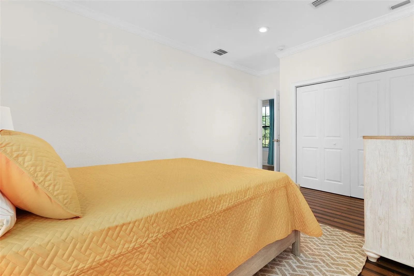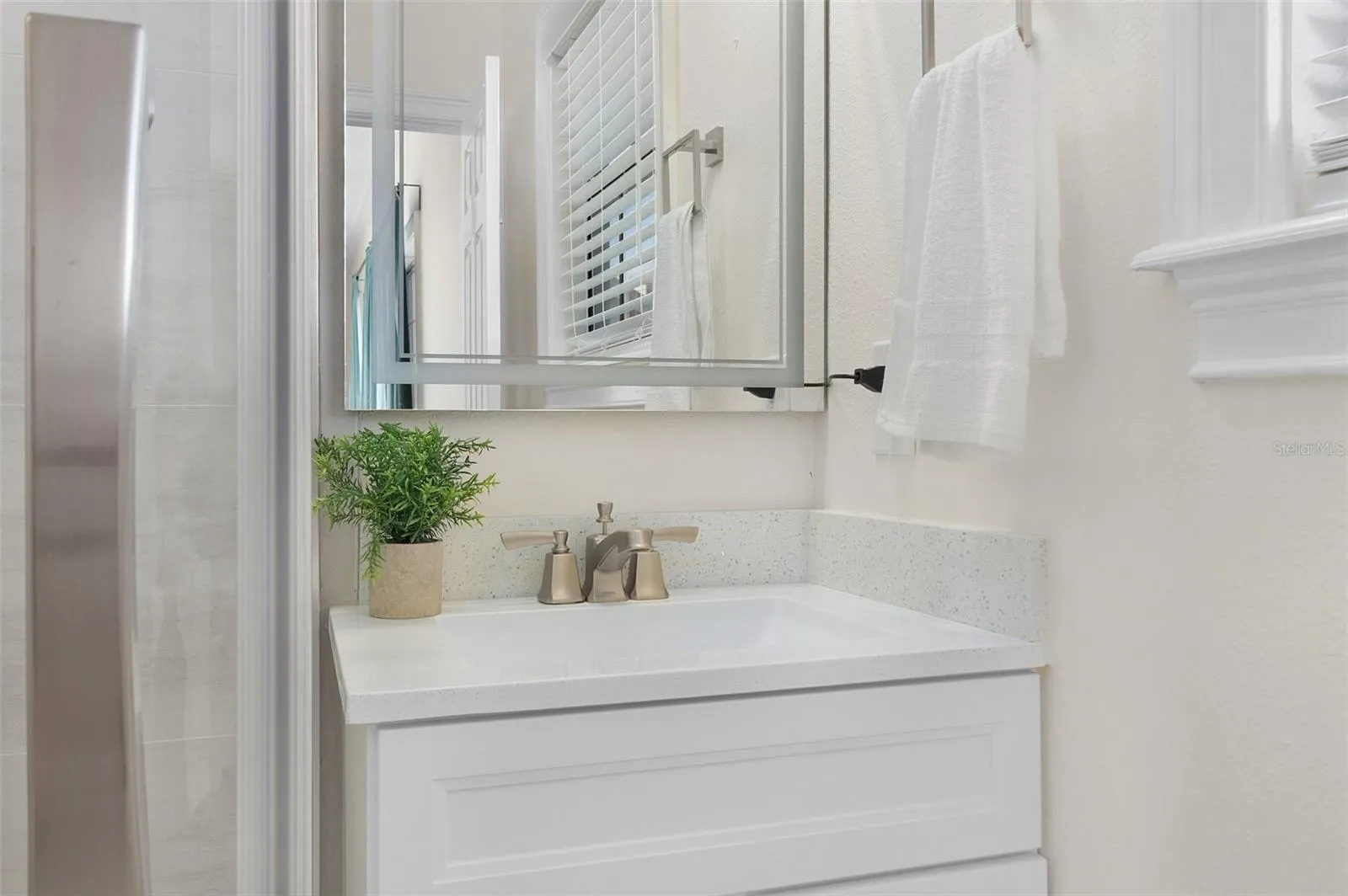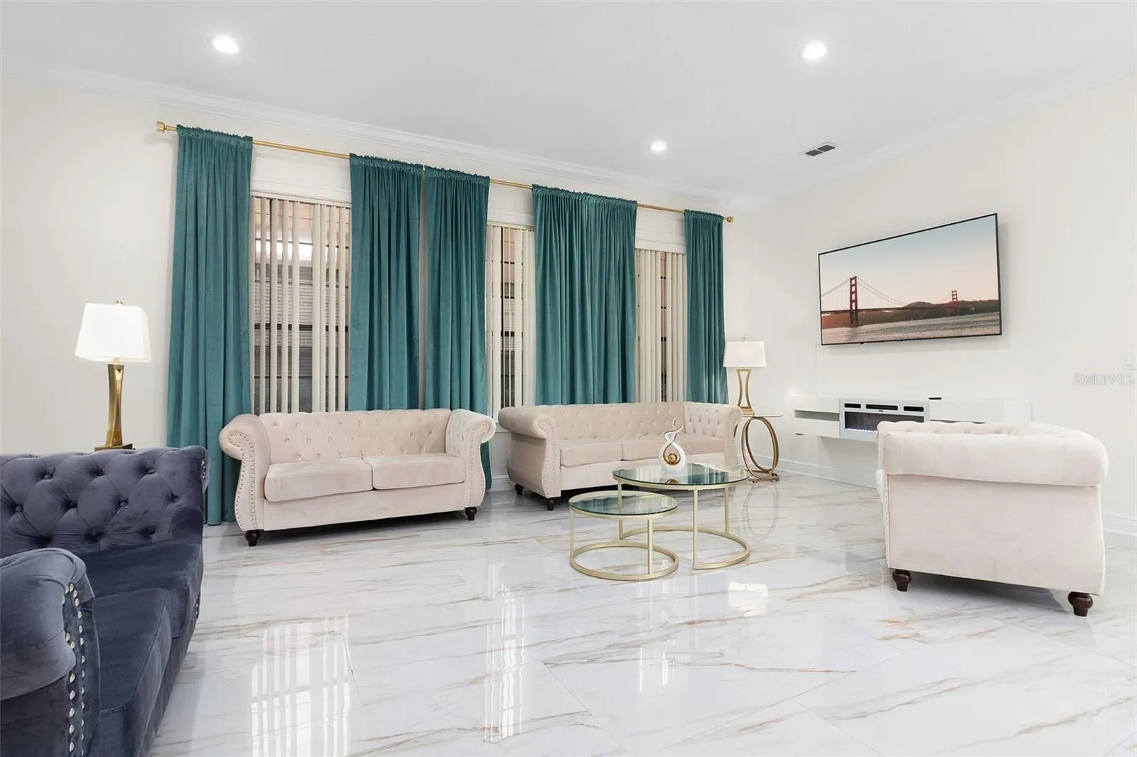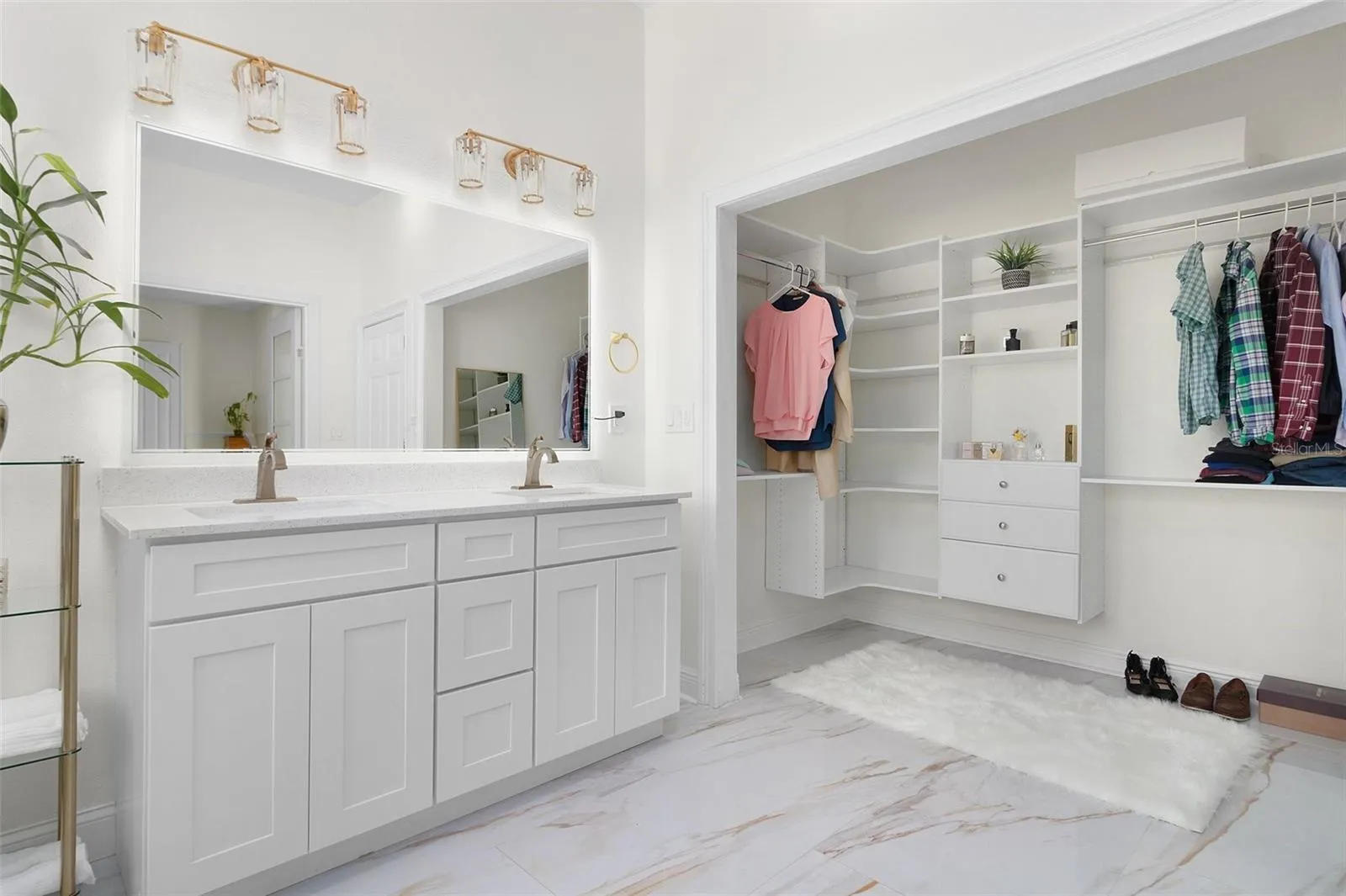 Enjoy meals or entertaining in the stylish dining room with an adjacent sunlit sitting area. The first-floor primary suite is a true retreat, complete with a spa-inspired bath offering a rain shower, soaking tub with ambient lighting, double vanity with quartz finishes, and a custom walk-in closet with built-ins—all accented in soothing gold and white tones. A second en-suite bedroom on the main level also opens to the pool, ideal for guests or multigenerational living.