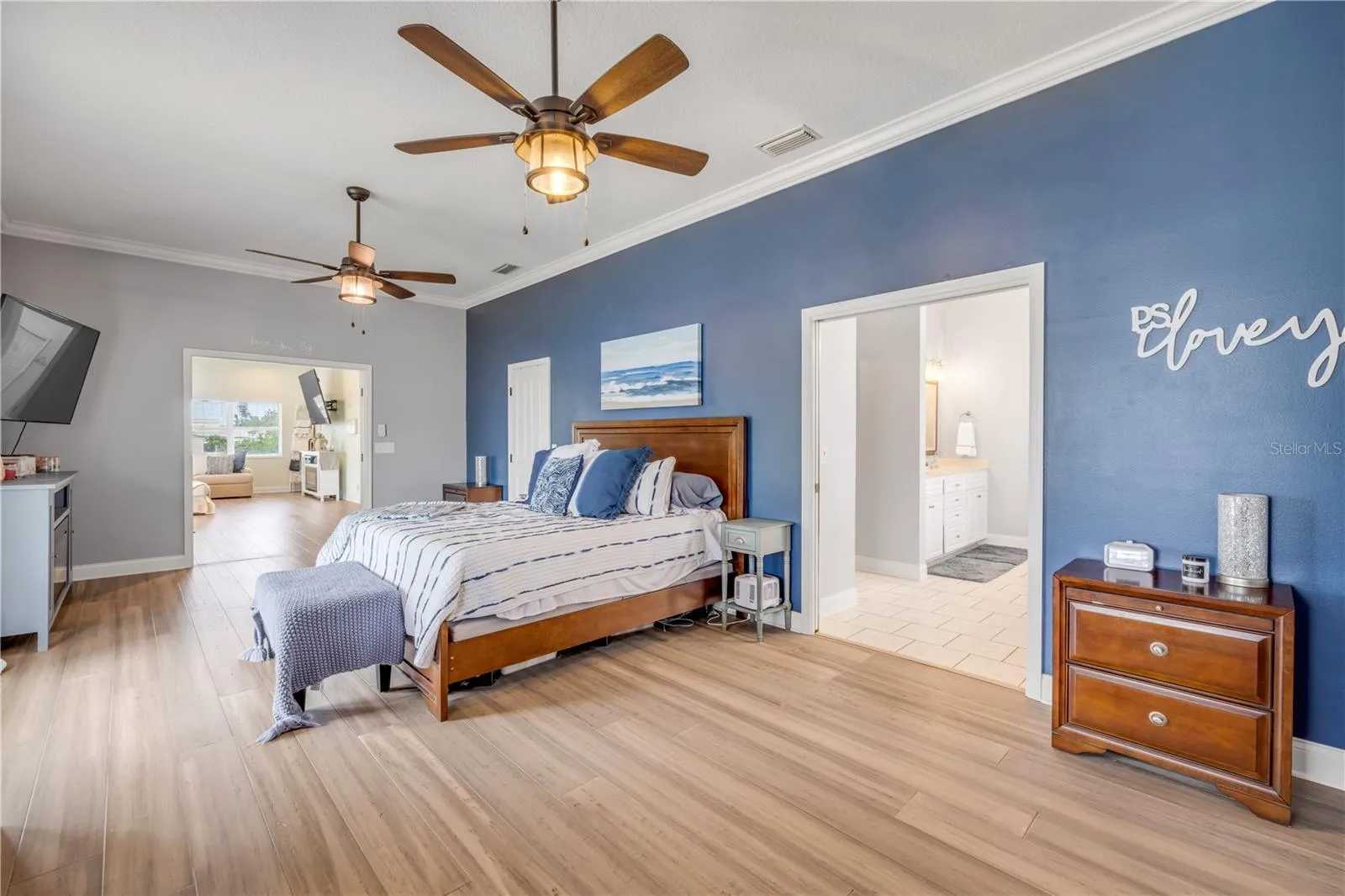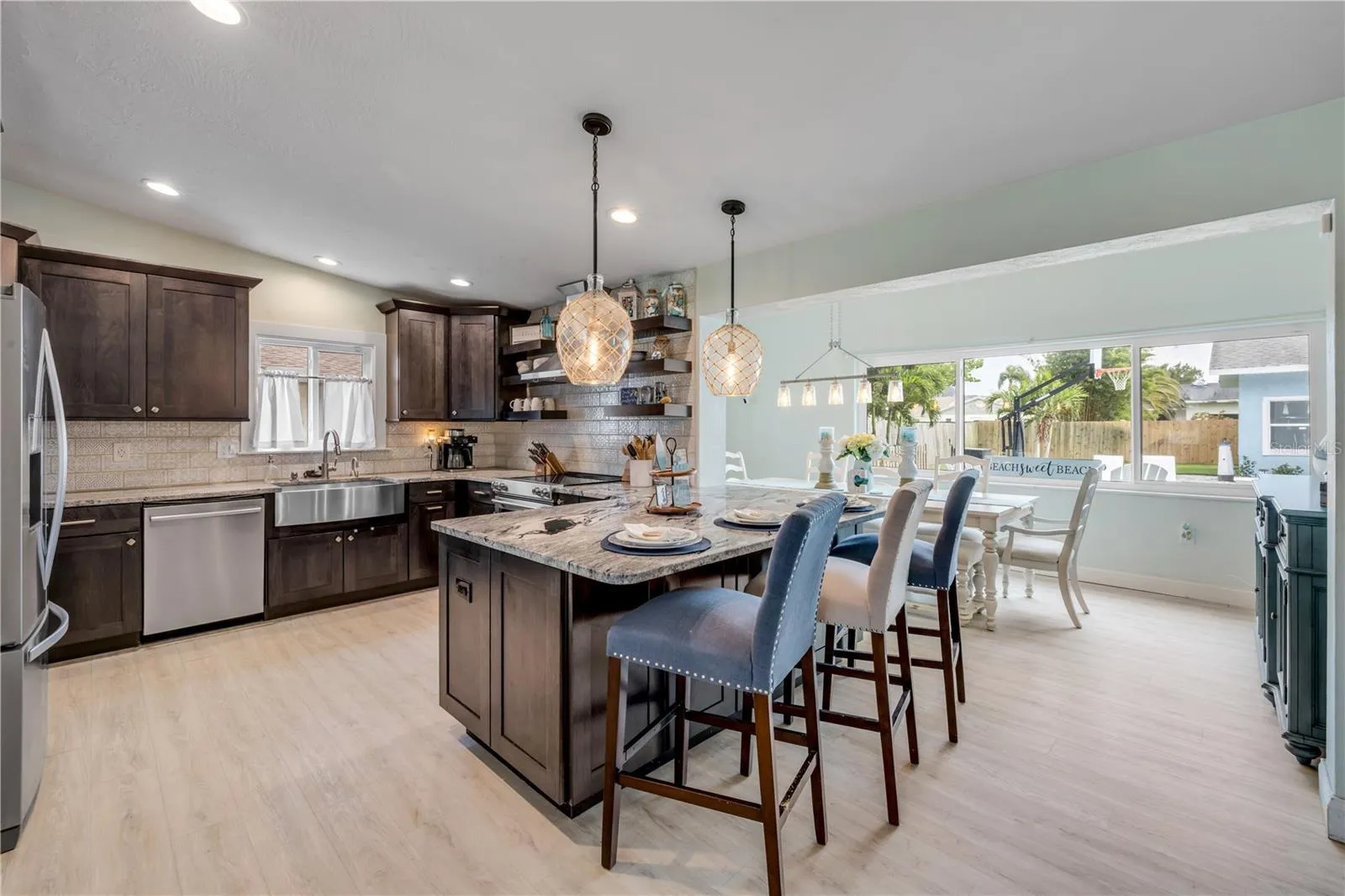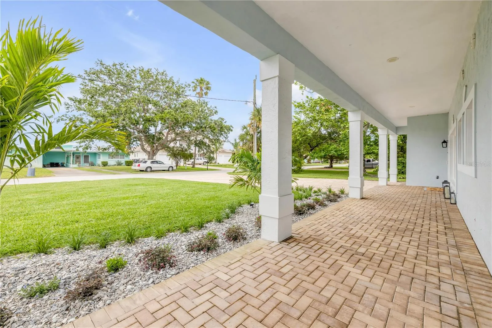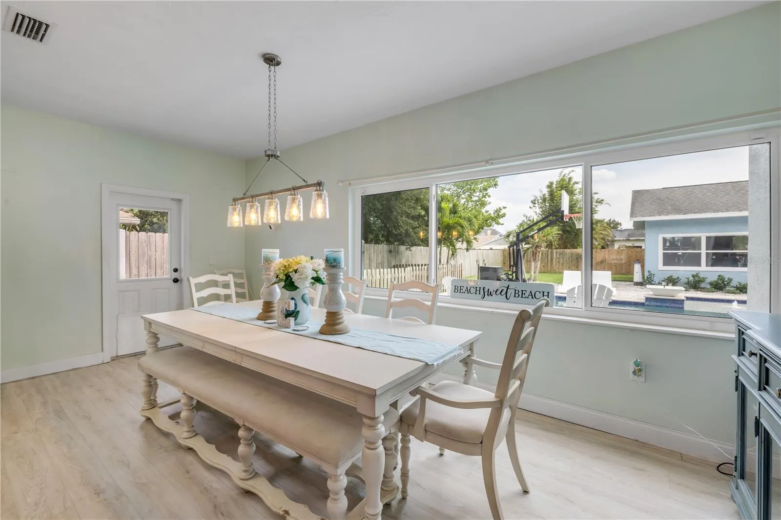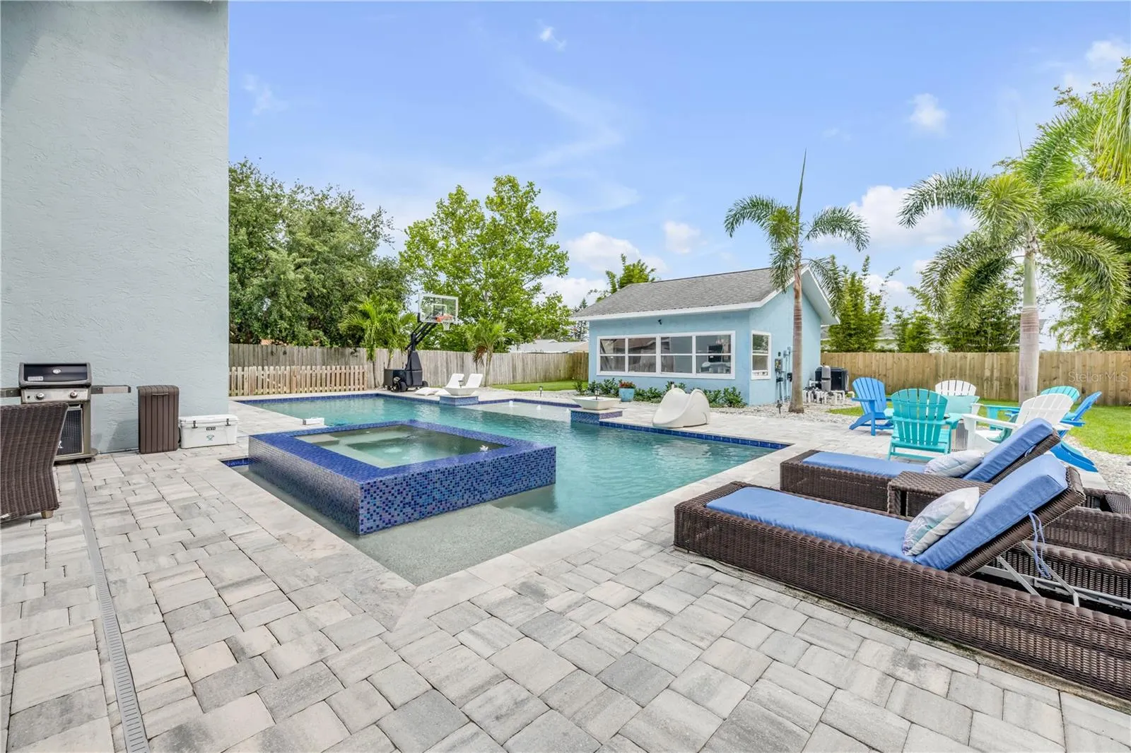 Enjoy tranquil water views, including a glimpse of the iconic Ponce Inlet Lighthouse with amazing views from the primary bedroom. A complete kitchen remodel with onyx cabinetry, granite countertops, presinte backsplash and kitchen aid appliances. A second-story renovation was completed in 2018, featuring Pergo flooring, crown molding, and fresh coastal tones. Between 2020 and 2021, the home was further transformed with luxury vinyl plank flooring throughout the main level, stylish new lighting, and the addition of a show-stopping 45’x20’ saltwater pool with an infinity-edge spa, lounging shelf, and seating ledge surrounded by pristine pavers. The exterior, including a 400 sq ft outbuilding with electricity, was freshly painted in 2022. In 2025, the outdoor living experience was elevated again with an extended paver driveway, seashell rock flower beds, lush St. Augustine grass, updated landscaping, and a new irrigation system. Whether hosting a sunset cookout on the double covered patio, gathering around the fire pit, or watching TV poolside with friends, this home offers unmatched space for entertaining and relaxing. The detached outbuilding is perfect as a pool house, guest suite, game room, or studio. Pet-friendly features include a fenced dog run, doggy door, and ample yard space to roam. Just minutes to the public boat ramp and a quick golf cart ride to Canal Street, Flagler Avenue, and the beach—this is the lifestyle that makes New Smyrna Beach so special. Additional upgrades include a 2018 roof, 2024 upstairs A/C, wireless thermostats, and keyless entry. Coastal charm, thoughtful upgrades, and an unbeatable location—this is NSB living at its finest.