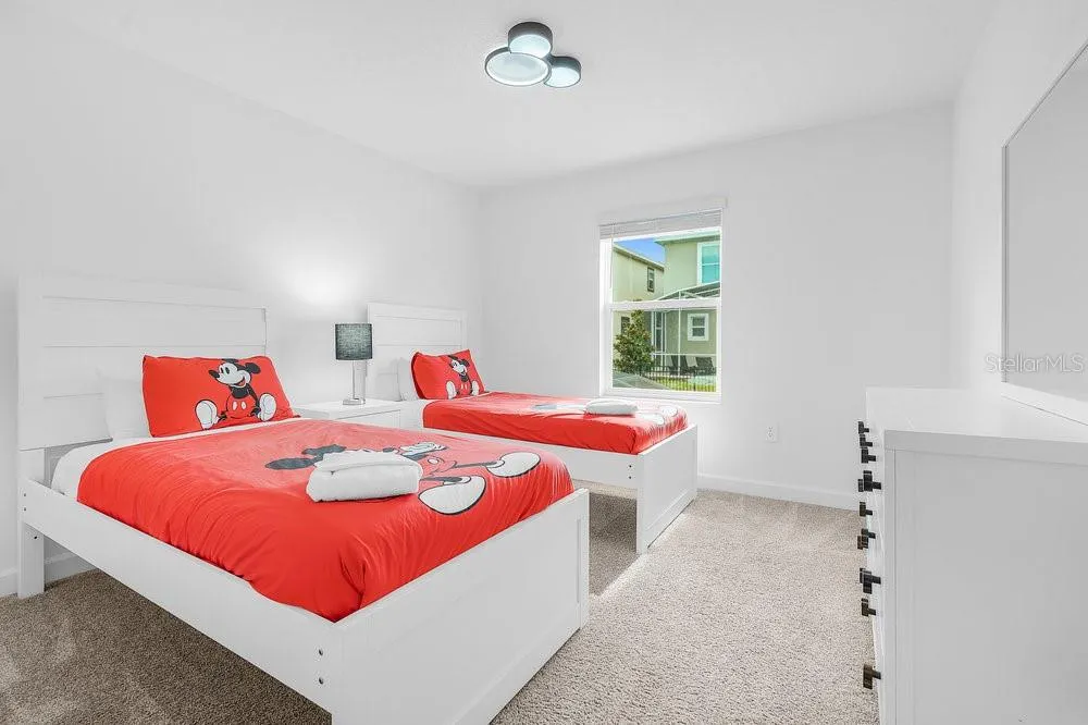 Downstairs features a guest bedroom and full bathroom, offering privacy and convenience for visiting family and friends. As you explore upstairs, you’ll find three additional bedrooms that provide plenty of space for guests or family, including a themed bedroom inspired by a beloved animated mouse—sure to be a favorite among kids and the young at heart. Each room has been tastefully decorated to reflect a clean, modern style with just the right amount of whimsy.